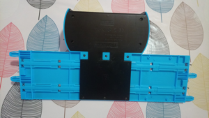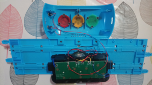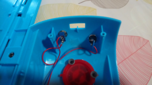Après ouverture du couvercle inférieur pour voir l’intérieur, il apparait que la conception est différente et qu’il y a nettement moins de place pour loger le connecteur et interrupteur. De plus les lamelles qui servent de contacte avec le support des piles sont soudées directement sur la carte électronique, ce qui complique les choses.