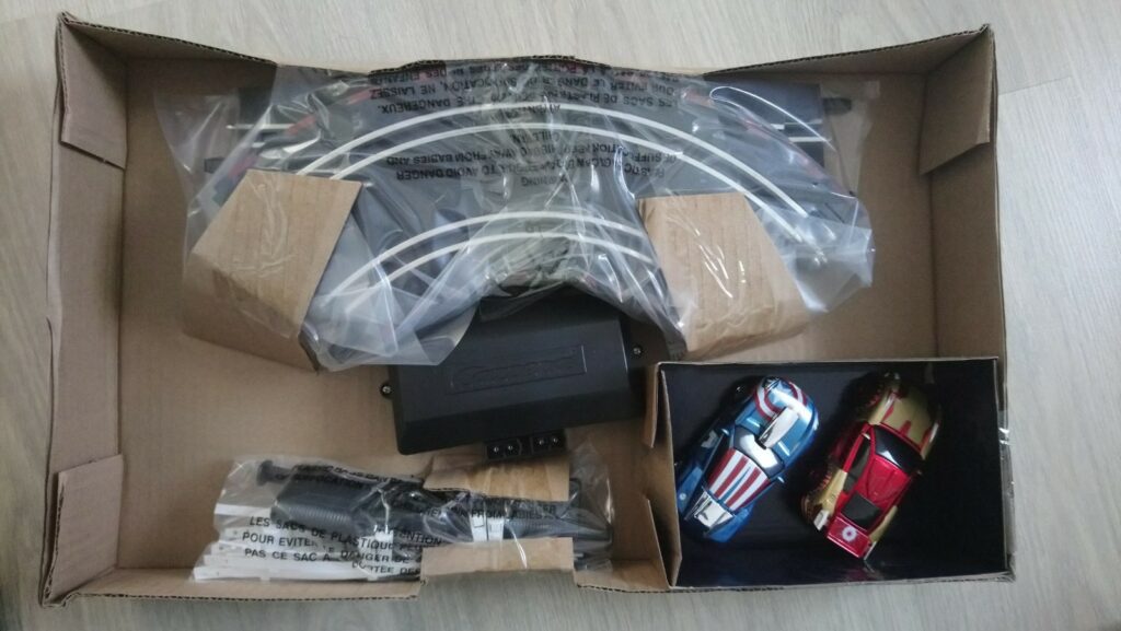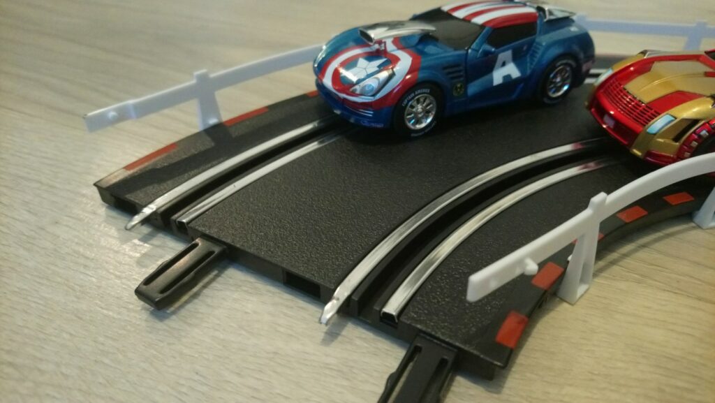 Coté accessoires fournis, il y a 12 barrières blanches fournies et quatre supports de piste pour le pont du huit.