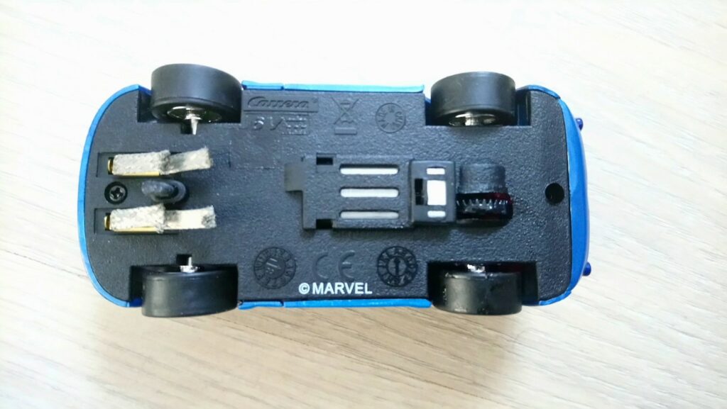 Les voitures sont visuellement totalement identiques aux voitures GO. Elles sont à l’échelle 1/43°, cependant sous le châssis un marquage indique 6V indiquant la différence avec une voiture GO. Le moteur est donc différent et optimisé pour une tension de 6V. Voyons maintenant les performances sur la piste.