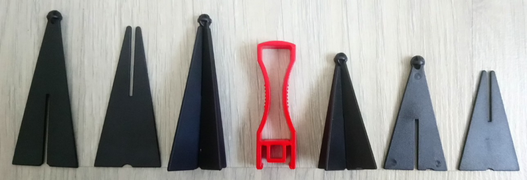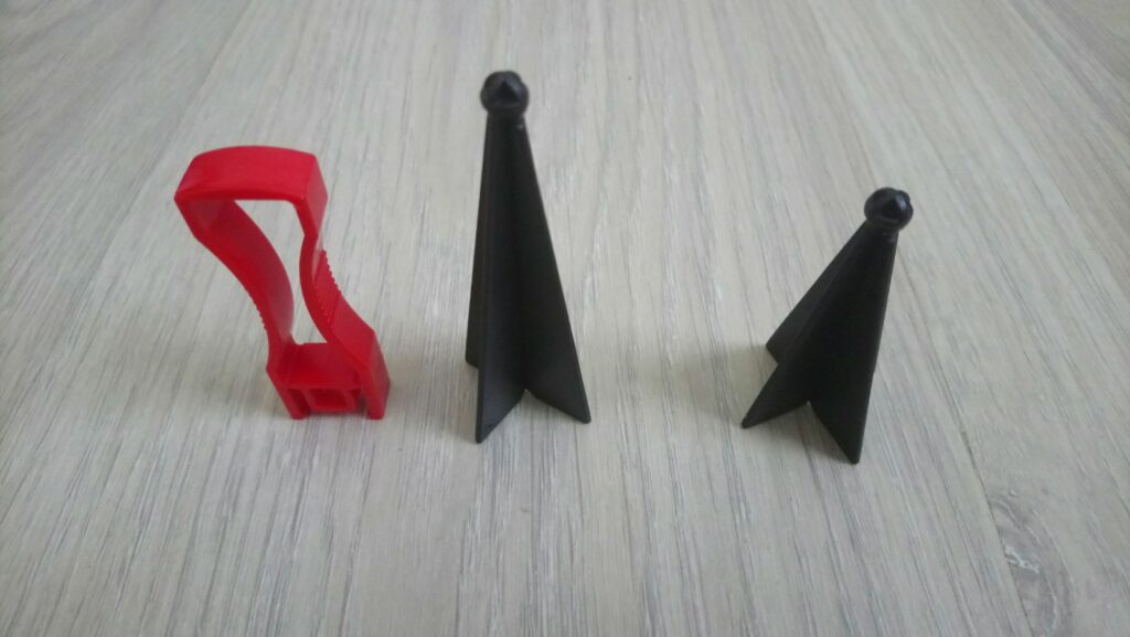 Les supports sont de deux hauteurs différentes pour réaliser le pont. Une paire mesure 56mm de haut et la seconde paire 45mm. Elles sont composées de deux plaques que l’on assemble perpendiculairement. C’est un système plus rudimentaire que les supports GO. Ci-contre une photo des supports a coté d’un support First qui reprend le même principe que les supports GO depuis 2017.