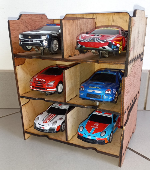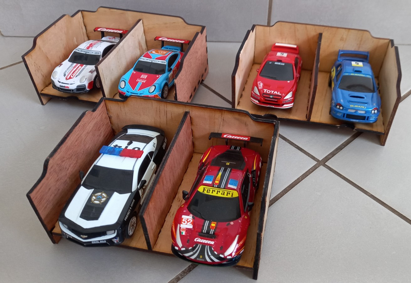 On peut aussi imaginer un petit logo Carrera (ou du modèle) gravé au fond ou sur le sol des étagères !