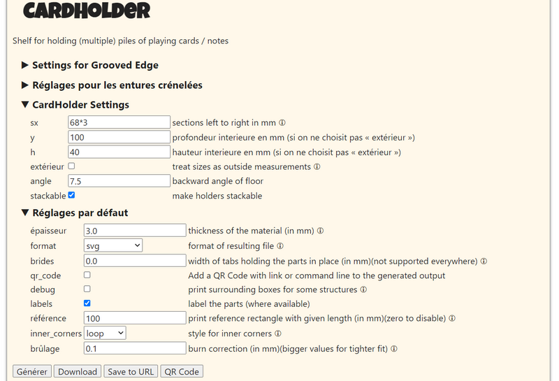 Il propose tout un tas de modèles à réaliser pour découpeuse laser. Ce qui est génial, c’est que l’on peut paramétrer les côtes pour l’adapter à nos besoins. Je vous laisse aller sur le site pour voir l’ensemble des réalisations possibles. Pour ma part, j’ai choisis un cardholder (range cartes) qui sera pour nous aussi un range voitures. https://www.festi.info/boxes.py/CardHolder?language=fr