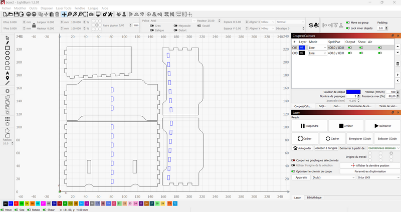 On importe le fichier dans le logiciel de découpe. J’en profite pour dessiner les fentes destinées au passage des guides.