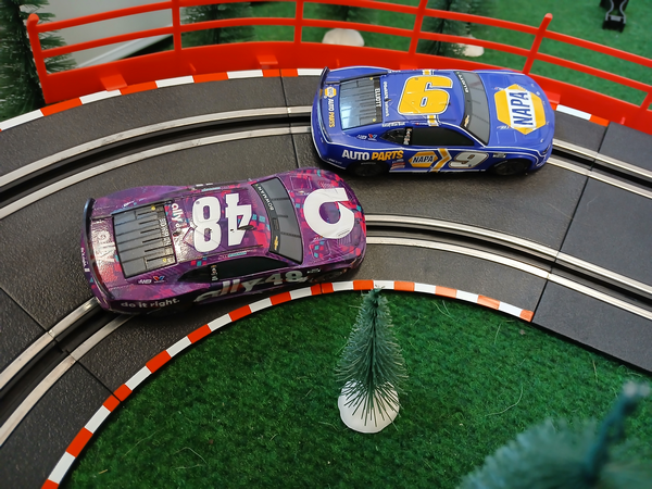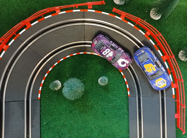 Egalement disponible dans le coffret les barrières hautes et souples en bord de piste font circuit NASCAR à 200%. On a envie d’en mettre tout le long à l’extérieur du ovale. Quand la voiture est sur la courbe relevé à l’extérieur et quelle frôle le grillage, on s’y croit.