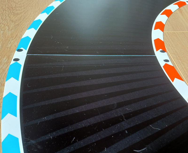 Par rapport à une piste de circuit routier qui a la contrainte de l’épaisseur et des fentes pour les guides des voitures, ici rien de tout cela.