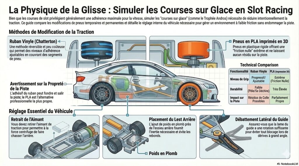 En slot racing comme en formule 1 on cherche a avoir les pneus qui collent au maximum à la piste pour transmettre le plus de puissance et avoir la meilleure accélération et vitesse de pointe. Et si pour le fun on essaye tout le contraire et faire un peu comme en rallye sur glace. Comment faire ? Mettre du scotch d’électricien sur les pneus pour réduire l’adhérence ou mettre un pneus en PLA d’impression 3D ? Prendre en compte de ne pas encrasser la piste.