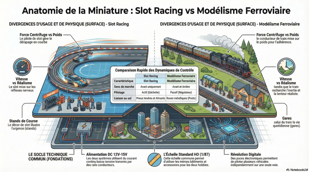 Bien que l’un soit axé sur la vitesse et la compétition (Slot Racing) et l’autre sur le réalisme et la gestion de réseau (Modélisme ferroviaire), ces deux mondes partagent un héritage technique très proche.