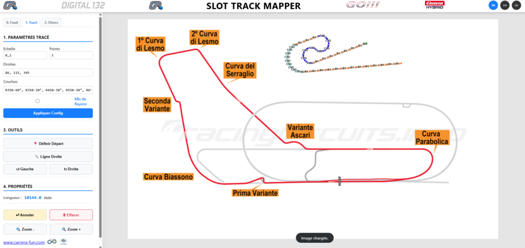 Vous pouvez importer une image (le plan d’un circuit réel par exemple) pour la placer en arrière-plan. Un curseur pratique vous permet d’ajuster la taille de cette image pour qu’elle corresponde à l’échelle souhaitée.