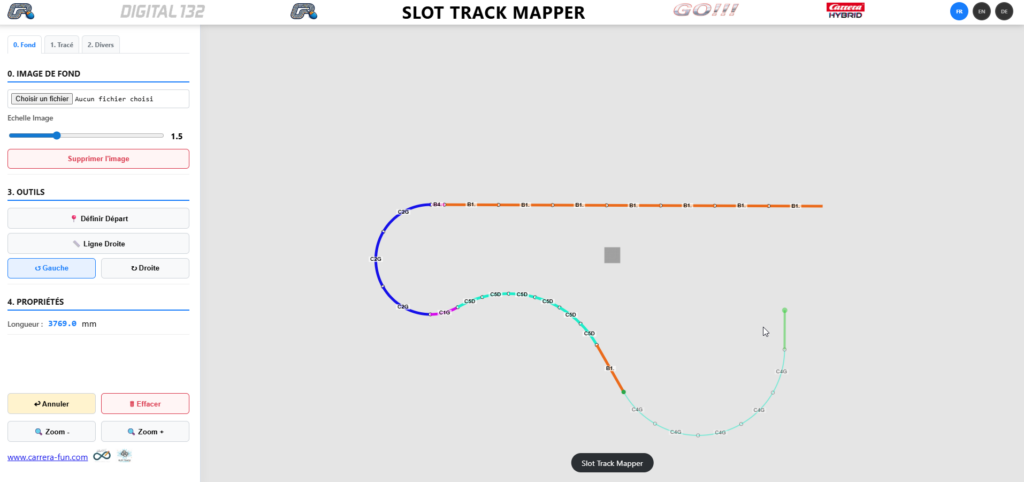 L’idée est simple : offrir un outil capable de « décalquer » un tracé réel ou de dessiner librement avec une assistance intelligente, pour obtenir un plan réalisable avec des rails Carrera. Notez qu’il n’est pas obligatoire d’utiliser une image de fond, l’outil fonctionne très bien pour de la création libre !