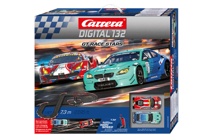 Le set DIGITAL 132 « GT Race Stars » de Carrera met en présence de véritables bolides sur la piste. Avec ses 585 chevaux, la BMW M6 GT3 « Team Falken, No.3 » se démarque rapidement, et c’est ainsi qu’elle s’est directement propulsée sur le podium lors de la quatrième course de la saison VLN 2017 sur le Nürnburgring en laissant la concurrence pantoise. Son concurrent, la Ferrari 488 GT3 « AF Corse, No. 51 » n’a pas de quoi rougir avec ses 550 ch, car cette voiture de course italienne est une championne d’endurance. Les manettes WIRELESS fournies promettent une course d’endurance pur plaisir, car les batteries offrent jusqu’à 8 heures de jeu en continu. [texte Carrera]