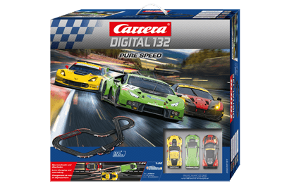 Trois – deux – un… partez! Trois bolides puissants se rendent sur la ligne de départ dans le kit Carrera DIGITAL 132 « Pure Speed »: l’imposante Lamborghini Huracán GT3 « N°63 », la Ferrari 458 Italia GT2 « AT Racing, N° 56 » très performante dans les virages et la Chevrolet Corvette C7. R « N°03 », le « marteau-pilon » américain. Tous les bolides s’étant déjà fait un nom, la tension monte sur le circuit Carrera de 8mètres de long. Changements de voie et passionnantes manœuvres de dépassement en vue! Qui a une longueur d’avance? [texte Carrera]