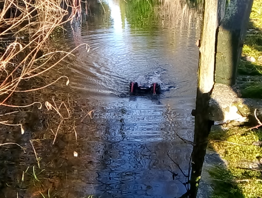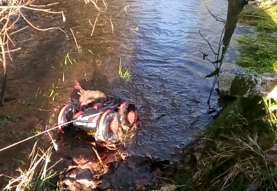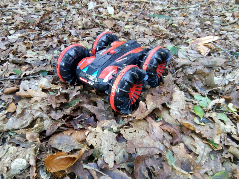 La bande de roulement en caoutchouc rouge au centre des roues permet une bonne accroche surtout sur le carrelage. Pour le plaisir dans la maison, c’est déjà gagné pour ce véhicule. Mais allons à l’extérieur. Gravier, terre, herbe (tondue), rien ne l’arrête. Allons du coté du petit lac pour vérifier ses capacités nautiques. Je me munie d’un grand bâton au cas ou elle ne puisse pas revenir au bord du lac. Je me dis que peut être elle va se transformer en sous-marin et sombrer. Je la regarde bien une dernière fois au cas ou !